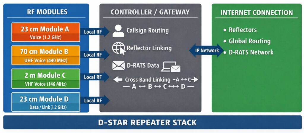 One of D-STAR’s defining features is its modular repeater stack design, combined with explicit routing and gateway control.