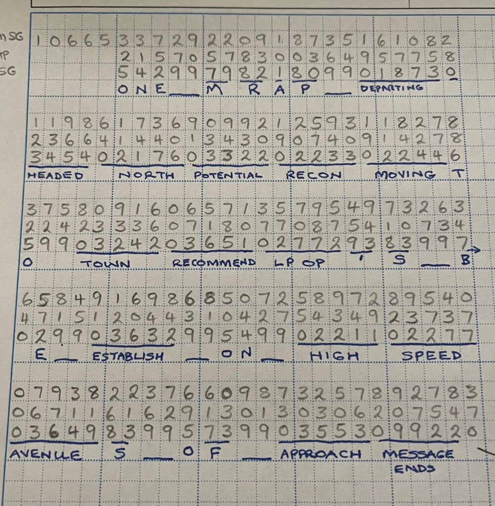 You are going to need two additional things to decode the message. One is the code book – a book that is used to take words or phrases and convert them to a 4-digit set of numbers. The main purpose is to shorten the number of digits for the word. A 5-letter word could take up to 10 digits to send it, plus two more to indicate a space (99 indicates a space or 91 for a period). A code word is 1 digit (0) to indicate what follows is a code word, then 4-digits for the word or phrase. As you know it is a code word there is usually no need to include the space (99) after the word. This can considerably shorten the message and can reduce errors in creating the coded message. In the example I didn’t have/use a codeword for MRAP. That took 9-digits to write out including the space characters. With a code word this could have been shortened to 5-digits. It’s now been added to my code book 🙂