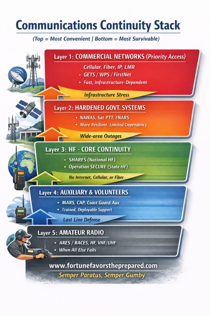 Communications continuity is not a single system but a layered stack of capabilities designed to function as infrastructure degrades. U.S. government continuity programs intentionally range from priority access on commercial networks to fully infrastructure-independent systems such as high-frequency (HF) radio. Programs like GETS, WPS, FirstNet, and satellite services provide priority during routine disruptions, while dedicated government networks and HF systems — including SHARES and FCC-authorized state disaster frequencies under Operation SECURE — ensure command, coordination, and situational awareness when cellular, fiber, internet, and even satellites fail. The most resilient communications plans recognize that failures are inevitable and deliberately integrate multiple tiers, with HF and auxiliary communications serving as the final, survivable layer that sustains operations when all other systems are unavailable.
