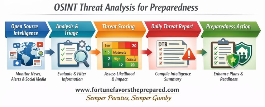 Turning Open Source Intelligence into Preparedness Awareness Preparedness is not just about equipment, supplies, or contingency plans. At its core, preparedness is about awareness — understanding what is happening in the world around you and recognizing early indicators of risk before they become crises. The modern information environment produces an enormous volume of publicly available data every day. Government alerts, infrastructure reports, cybersecurity advisories, news reporting, and social media signals all contain pieces of the threat picture. The challenge is not finding information. The challenge is systematically analyzing it. This is where Open Source Intelligence (OSINT) becomes one of the most valuable tools in preparedness. By conducting a structured Daily Threat Analysis, individuals and organizations can detect emerging hazards, infrastructure disruptions, cyber incidents, and geopolitical developments before they directly affect operations or safety. A disciplined OSINT process allows a preparedness-minded individual to answer one critical question each day: “What developments today could affect me, my community, or my operations in the next 72 hours?” The methodology below is based on a structured OSINT process used to produce a Daily Threat Report (DTR) — a consolidated intelligence product designed to give decision-makers a clear situational picture of emerging risks. Why...