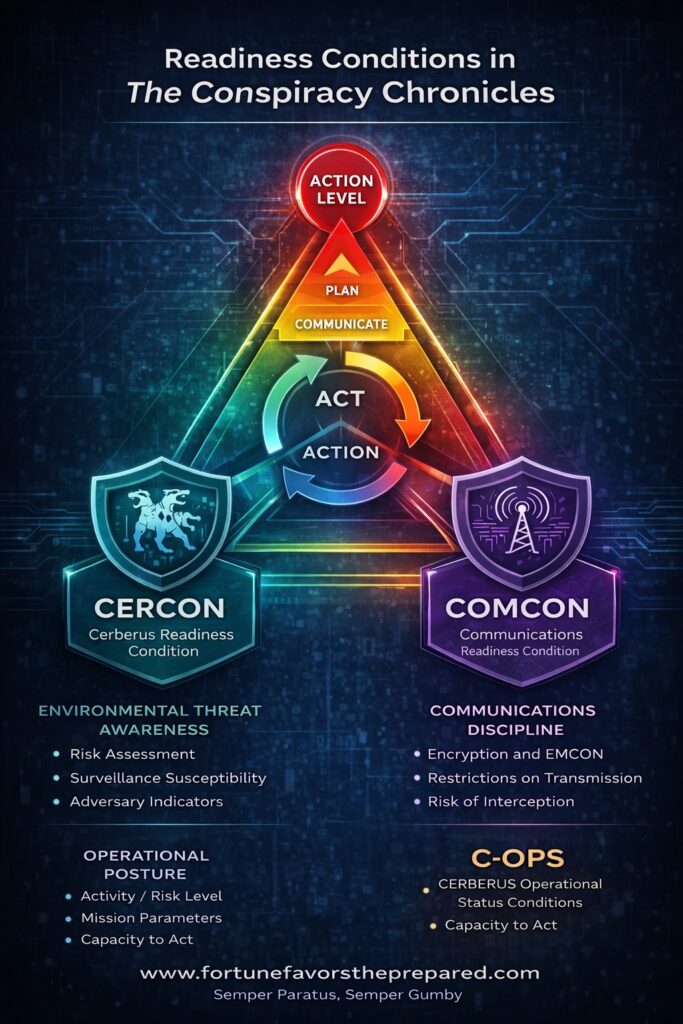 Although CERCON, COMCON, C-OPS, and COCNON are fictional constructs, they are deliberately modeled after real readiness and condition frameworks used by military, intelligence, and emergency organizations.