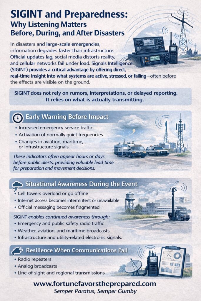 Preparedness rises or falls on awareness. When disasters disrupt infrastructure, overload networks, and distort information, Signals Intelligence (SIGINT) remains one of the few reliable ways to understand what is actually happening in real time. By passively observing communications, electronic activity, and system behavior, SIGINT provides early warning, confirms reality during chaos, and supports better decisions when timing matters most. You don’t need to hear every message—you need to recognize the patterns early enough to act. In preparedness, those who listen well move first, adapt faster, and reduce surprise.