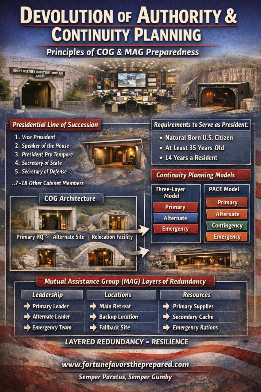 At the national level, this concept forms the backbone of Continuity of Government (COG) planning for the United States. But the principles used by federal continuity planners are not unique to government. The same ideas appear in corporate continuity plans, emergency management doctrine, preparedness planning, and even small community mutual assistance groups (MAGs).