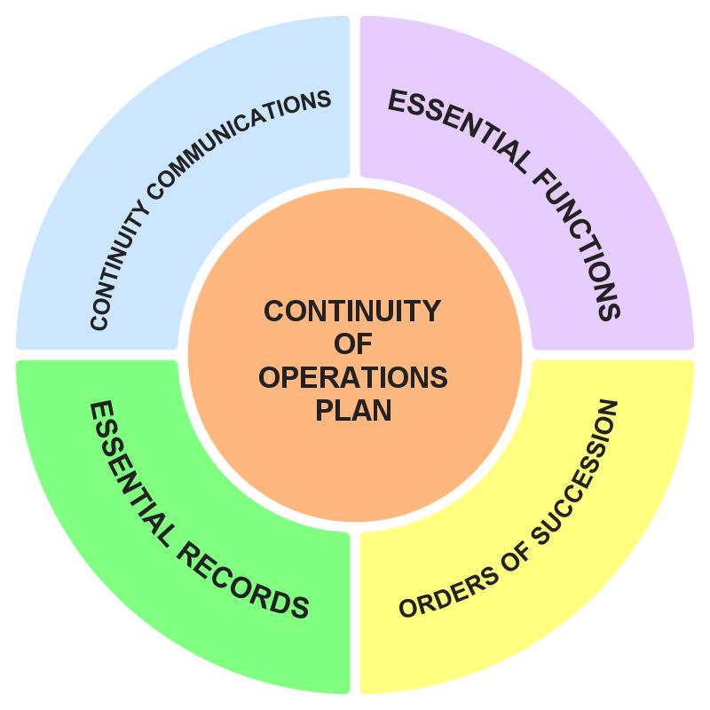A continuity of operations (COOP) plan is your blueprint on how you modify your operations to continue to provide some services. It includes orders of succession, who is in charge if the boss is incapacitated and is usually three deep. This part of the plan includes the necessary authorities for the second in command to execute and continue business, such as legal documents giving them the necessary authority. This is the same as the orders of succession that exist in local, state and the federal government, except they are called continuity of government plans.